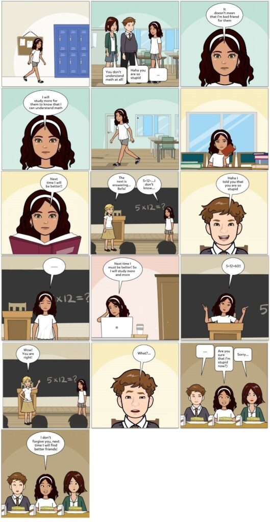 Цього року, обговорюючи тему булінгу, ми вирішили створити комікси. Я запропонувала цю ідею дітям, і учні підхопили її. Адже робота над коміксами – це не лише цікаво та незвично. Така діяльність розвиває творчі здібності, збільшує словниковий запас і допомагає позбутися розмовного бар’єру. Кожен обирає собі техніку створення коміксів за своїми інтересами. Хтось малював, хтось створював за комп’ютерною програмою, але кожен представляв роботу із задоволенням, бо це його творчість та праця. Робота стовідсотково дозволила збільшити словниковий запас і допомогла позбутися розмовного бар’єру.